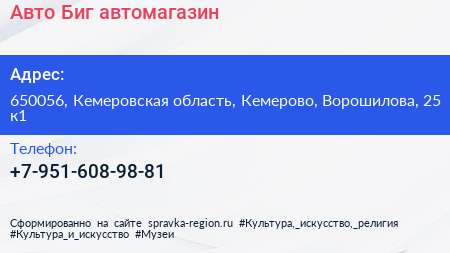 Авто-Биг, автомагазин по адресу 650056, Кемеровская область, Кемерово, Ворошилова, 25 к1 в дальнейшем Организация, размещена в следующих категориях: