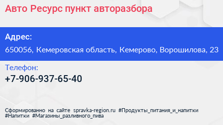 Авто Ресурс, пункт авторазбора по адресу 650056, Кемеровская область, Кемерово, Ворошилова, 23 в дальнейшем Организация, размещена в следующих категориях: