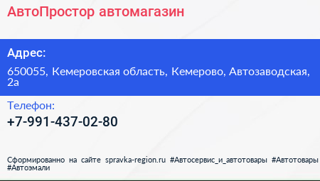 АвтоПростор, автомагазин по адресу 650055, Кемеровская область, Кемерово, Автозаводская, 2а в дальнейшем Организация, размещена в следующих категориях: