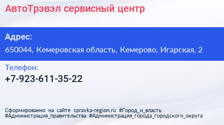 АвтоТрэвэл, сервисный центр по адресу 650044, Кемеровская область, Кемерово, Игарская, 2 в дальнейшем Организация, размещена в следующих категориях: