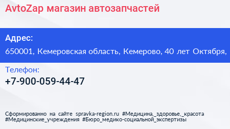 AvtoZap, магазин автозапчастей по адресу 650001, Кемеровская область, Кемерово, 40 лет Октября, 1 в дальнейшем Организация, размещена в следующих категориях: