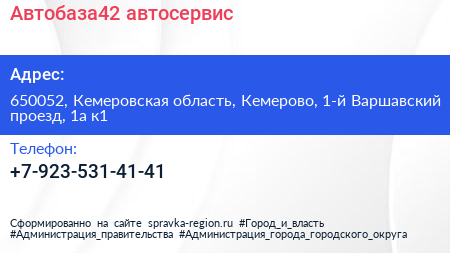 Автобаза42, автосервис по адресу 650052, Кемеровская область, Кемерово, 1-й Варшавский проезд, 1а к1 в дальнейшем Организация, размещена в следующих категориях: