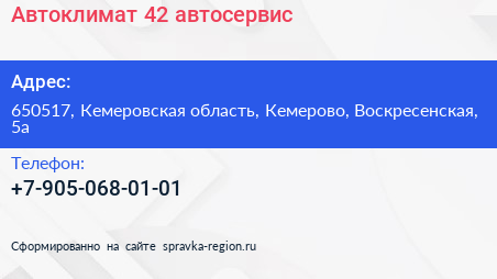 Автоклимат 42, автосервис по адресу 650517, Кемеровская область, Кемерово, Воскресенская, 5а в дальнейшем Организация, размещена в следующих категориях: