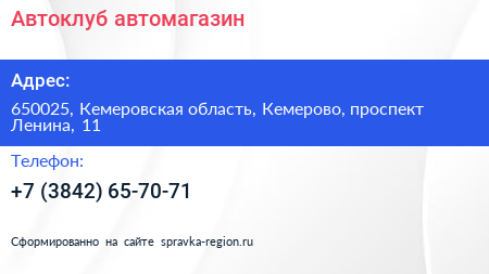 Автоклуб, автомагазин по адресу 650025, Кемеровская область, Кемерово, проспект Ленина, 11 в дальнейшем Организация, размещена в следующих категориях: