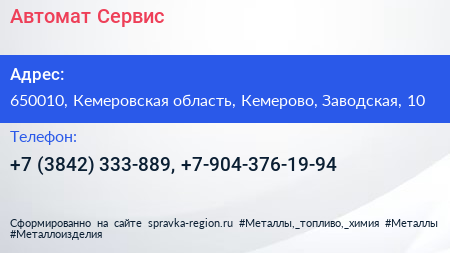 Автомат Сервис по адресу 650010, Кемеровская область, Кемерово, Заводская, 10 в дальнейшем Организация, размещена в следующих категориях: