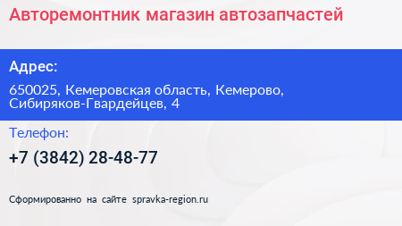 Авторемонтник, магазин автозапчастей по адресу 650025, Кемеровская область, Кемерово, Сибиряков-Гвардейцев, 4 в дальнейшем Организация, размещена в следующих категориях: