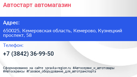 Автостарт, автомагазин по адресу 650025, Кемеровская область, Кемерово, Кузнецкий проспект, 58 в дальнейшем Организация, размещена в следующих категориях: