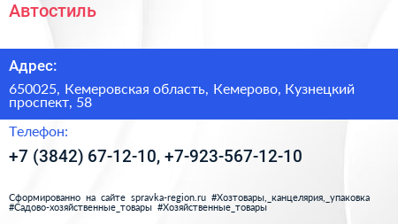 Автостиль по адресу 650025, Кемеровская область, Кемерово, Кузнецкий проспект, 58 в дальнейшем Организация, размещена в следующих категориях: