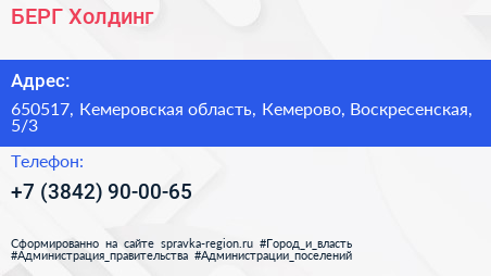 БЕРГ Холдинг по адресу 650517, Кемеровская область, Кемерово, Воскресенская, 5/3 в дальнейшем Организация, размещена в следующих категориях: