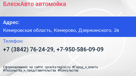 БлескАвто, автомойка по адресу Кемеровская область, Кемерово, Дзержинского, 2в в дальнейшем Организация, размещена в следующих категориях:
