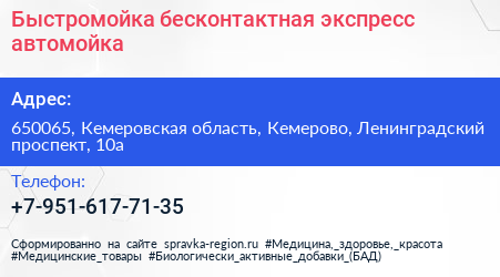 Быстромойка, бесконтактная экспресс-автомойка по адресу 650065, Кемеровская область, Кемерово, Ленинградский проспект, 10а в дальнейшем Организация, размещена в следующих категориях: