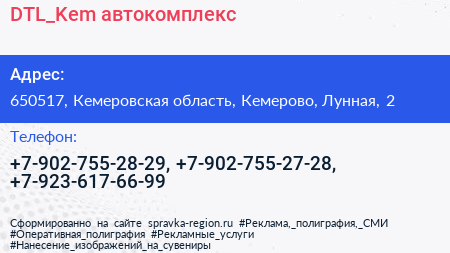 DTL_Kem, автокомплекс по адресу 650517, Кемеровская область, Кемерово, Лунная, 2 в дальнейшем Организация, размещена в следующих категориях: