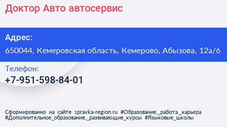 Доктор-Авто, автосервис по адресу 650044, Кемеровская область, Кемерово, Абызова, 12а/6 в дальнейшем Организация, размещена в следующих категориях: