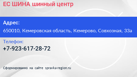 ЕС-ШИНА, шинный центр по адресу 650010, Кемеровская область, Кемерово, Совхозная, 33а в дальнейшем Организация, размещена в следующих категориях: