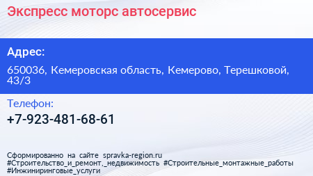 Экспресс моторс, автосервис по адресу 650036, Кемеровская область, Кемерово, Терешковой, 43/3 в дальнейшем Организация, размещена в следующих категориях: