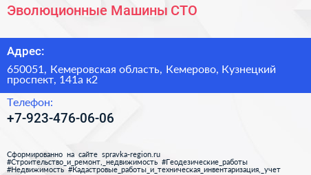 Эволюционные Машины, СТО по адресу 650051, Кемеровская область, Кемерово, Кузнецкий проспект, 141а к2 в дальнейшем Организация, размещена в следующих категориях: