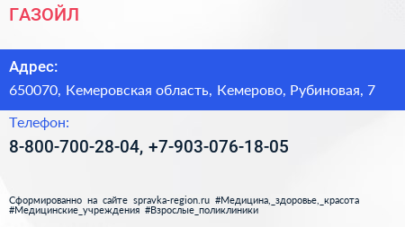 ГАЗОЙЛ по адресу 650070, Кемеровская область, Кемерово, Рубиновая, 7 в дальнейшем Организация, размещена в следующих категориях: