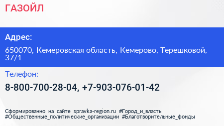 ГАЗОЙЛ по адресу 650070, Кемеровская область, Кемерово, Терешковой, 37/1 в дальнейшем Организация, размещена в следующих категориях: