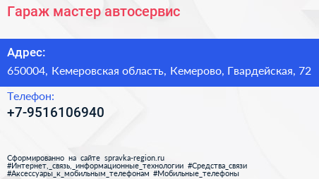 Гараж мастер, автосервис по адресу 650004, Кемеровская область, Кемерово, Гвардейская, 72 в дальнейшем Организация, размещена в следующих категориях: