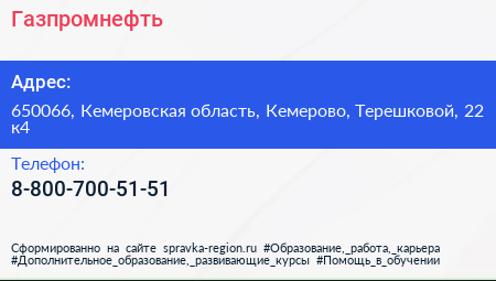 Газпромнефть по адресу 650066, Кемеровская область, Кемерово, Терешковой, 22 к4 в дальнейшем Организация, размещена в следующих категориях: