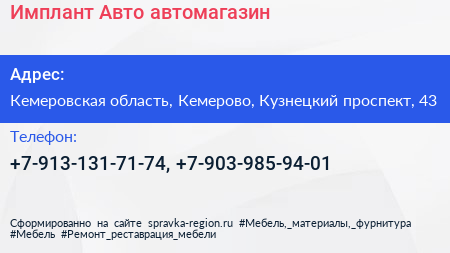 Имплант-Авто, автомагазин по адресу Кемеровская область, Кемерово, Кузнецкий проспект, 43 в дальнейшем Организация, размещена в следующих категориях: