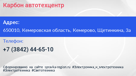 Карбон, автотехцентр по адресу 650010, Кемеровская область, Кемерово, Щетинкина, 3а в дальнейшем Организация, размещена в следующих категориях: