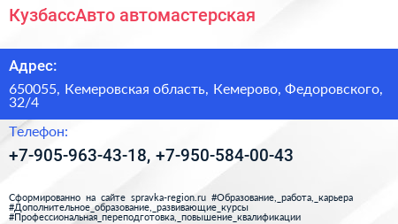 КузбассАвто, автомастерская по адресу 650055, Кемеровская область, Кемерово, Федоровского, 32/4 в дальнейшем Организация, размещена в следующих категориях: