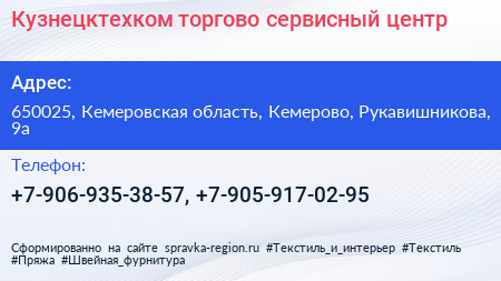 Кузнецктехком, торгово-сервисный центр по адресу 650025, Кемеровская область, Кемерово, Рукавишникова, 9а в дальнейшем Организация, размещена в следующих категориях: