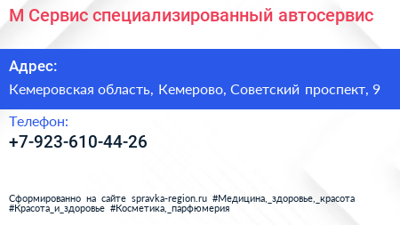 М-Сервис, специализированный автосервис по адресу Кемеровская область, Кемерово, Советский проспект, 9 в дальнейшем Организация, размещена в следующих категориях: