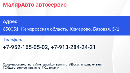 МалярАвто, автосервис по адресу 650051, Кемеровская область, Кемерово, Базовая, 5/1 в дальнейшем Организация, размещена в следующих категориях: