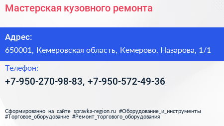 Мастерская кузовного ремонта по адресу 650001, Кемеровская область, Кемерово, Назарова, 1/1 в дальнейшем Организация, размещена в следующих категориях: