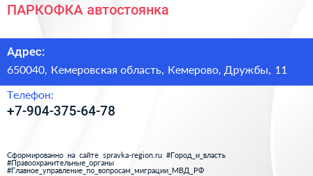 ПАРКОФКА, автостоянка по адресу 650040, Кемеровская область, Кемерово, Дружбы, 11 в дальнейшем Организация, размещена в следующих категориях: