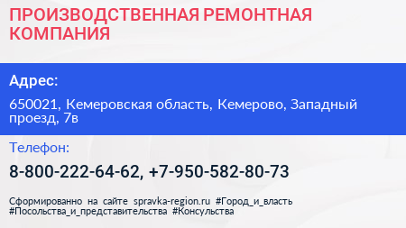 ПРОИЗВОДСТВЕННАЯ РЕМОНТНАЯ КОМПАНИЯ по адресу 650021, Кемеровская область, Кемерово, Западный проезд, 7в в дальнейшем Организация, размещена в следующих категориях: