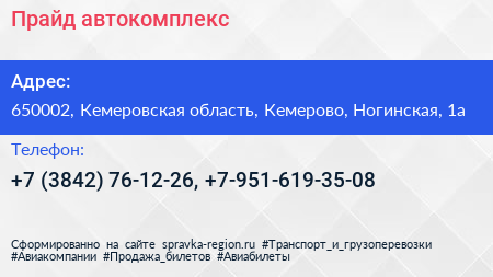 Прайд, автокомплекс по адресу 650002, Кемеровская область, Кемерово, Ногинская, 1а в дальнейшем Организация, размещена в следующих категориях: