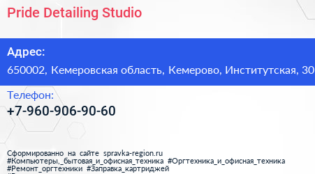 Pride Detailing Studio по адресу 650002, Кемеровская область, Кемерово, Институтская, 30 в дальнейшем Организация, размещена в следующих категориях: