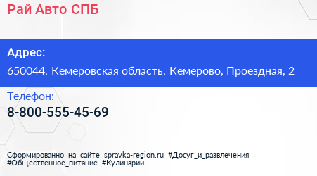 Рай Авто СПБ по адресу 650044, Кемеровская область, Кемерово, Проездная, 2 в дальнейшем Организация, размещена в следующих категориях: