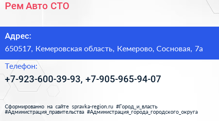 Рем-Авто, СТО по адресу 650517, Кемеровская область, Кемерово, Сосновая, 7а в дальнейшем Организация, размещена в следующих категориях: