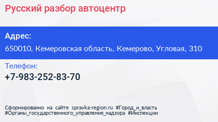 Русский разбор, автоцентр по адресу 650010, Кемеровская область, Кемерово, Угловая, 310 в дальнейшем Организация, размещена в следующих категориях: