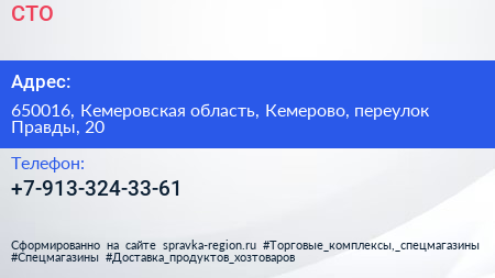 СТО по адресу 650016, Кемеровская область, Кемерово, переулок Правды, 20 в дальнейшем Организация, размещена в следующих категориях: