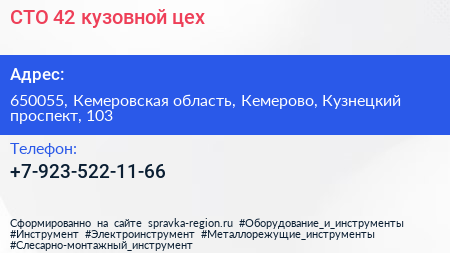 СТО-42, кузовной цех по адресу 650055, Кемеровская область, Кемерово, Кузнецкий проспект, 103 в дальнейшем Организация, размещена в следующих категориях: