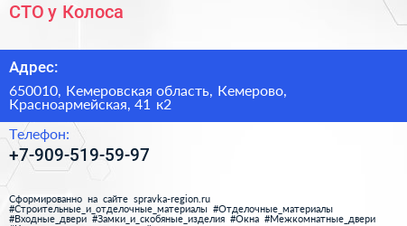 СТО у Колоса по адресу 650010, Кемеровская область, Кемерово, Красноармейская, 41 к2 в дальнейшем Организация, размещена в следующих категориях: