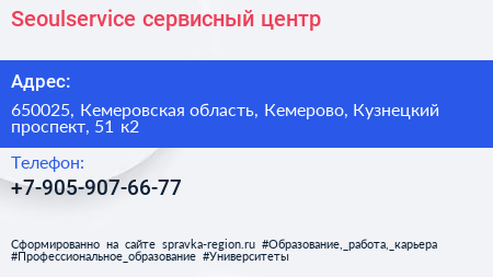 Seoulservice, сервисный центр по адресу 650025, Кемеровская область, Кемерово, Кузнецкий проспект, 51 к2 в дальнейшем Организация, размещена в следующих категориях: