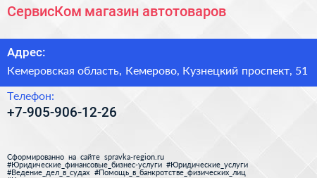 СервисКом, магазин автотоваров по адресу Кемеровская область, Кемерово, Кузнецкий проспект, 51 в дальнейшем Организация, размещена в следующих категориях: