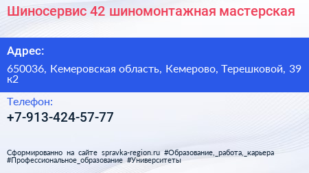 Шиносервис 42, шиномонтажная мастерская по адресу 650036, Кемеровская область, Кемерово, Терешковой, 39 к2 в дальнейшем Организация, размещена в следующих категориях: