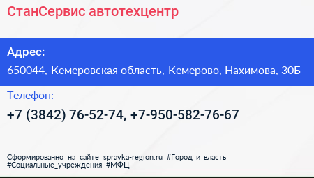 СтанСервис, автотехцентр по адресу 650044, Кемеровская область, Кемерово, Нахимова, 30Б в дальнейшем Организация, размещена в следующих категориях: