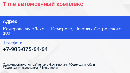 Time, автомоечный комплекс по адресу Кемеровская область, Кемерово, Николая Островского, 10а в дальнейшем Организация, размещена в следующих категориях: