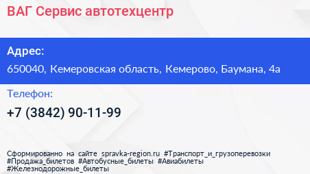 ВАГ Сервис, автотехцентр по адресу 650040, Кемеровская область, Кемерово, Баумана, 4а в дальнейшем Организация, размещена в следующих категориях: