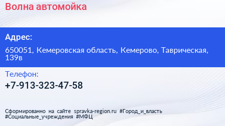 Волна, автомойка по адресу 650051, Кемеровская область, Кемерово, Таврическая, 139в в дальнейшем Организация, размещена в следующих категориях: