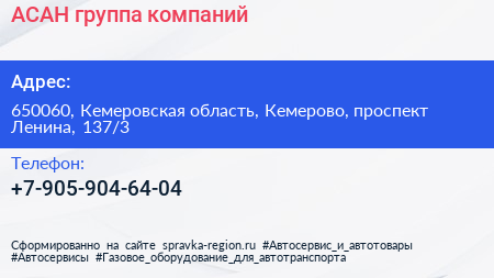 АСАН, группа компаний по адресу 650060, Кемеровская область, Кемерово, проспект Ленина, 137/3 в дальнейшем Организация, размещена в следующих категориях: