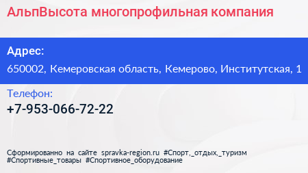 АльпВысота, многопрофильная компания по адресу 650002, Кемеровская область, Кемерово, Институтская, 1 в дальнейшем Организация, размещена в следующих категориях: